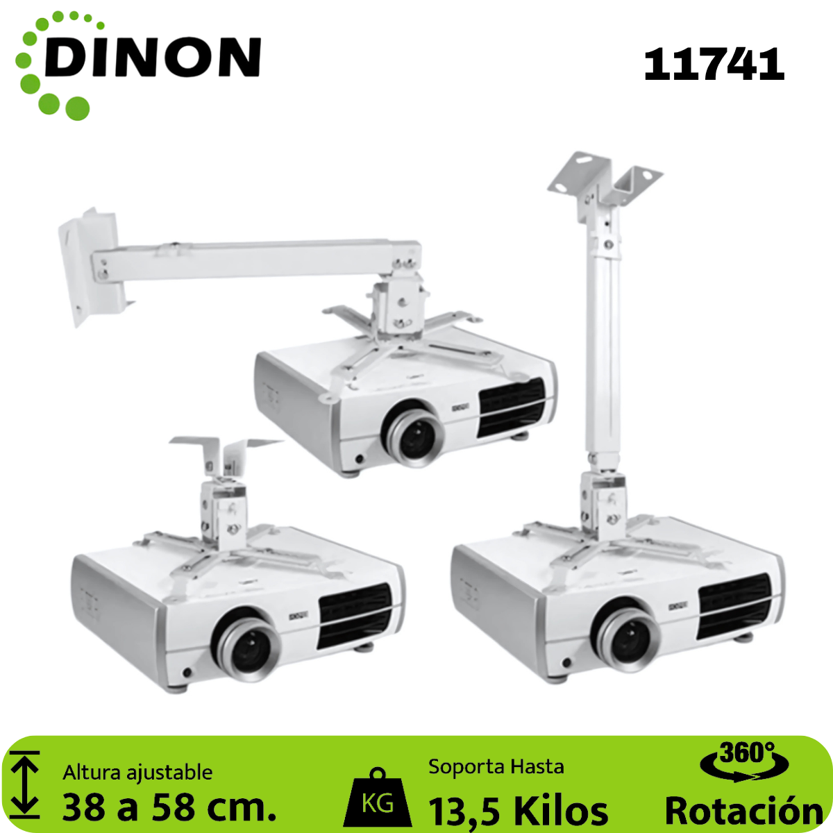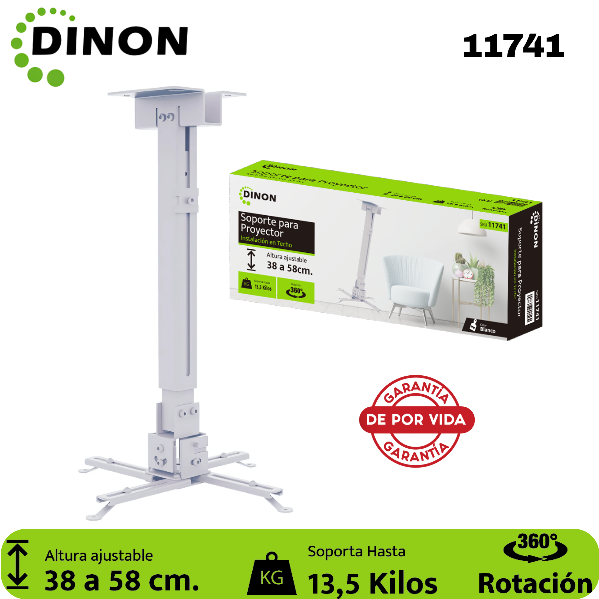 Soporte para Proyector a Techo Extensible 38-58 cm, 360°, 13.5 kg, Blanco, Dinon - SKU: 11741