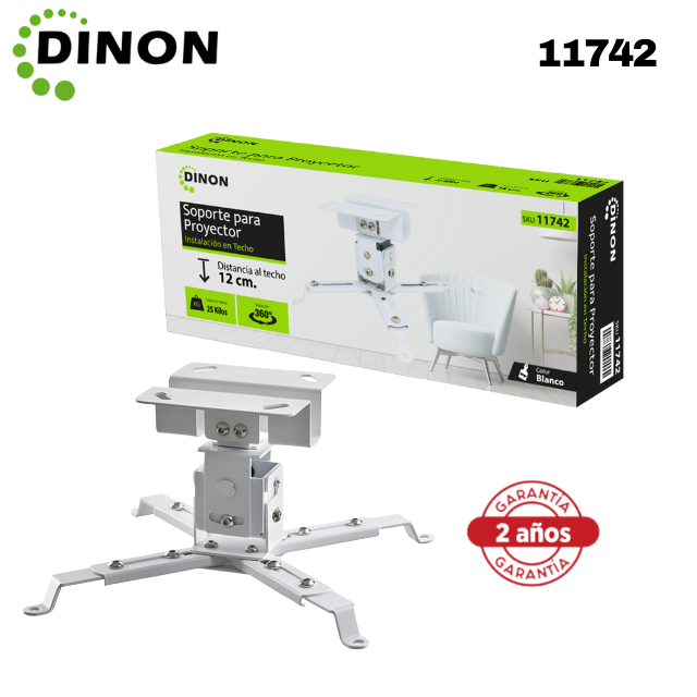 Soporte Proyector a Techo 12 cm, -15°/+10°, 360°, 25 kg, Blanco, Dinon - SKU: 11742